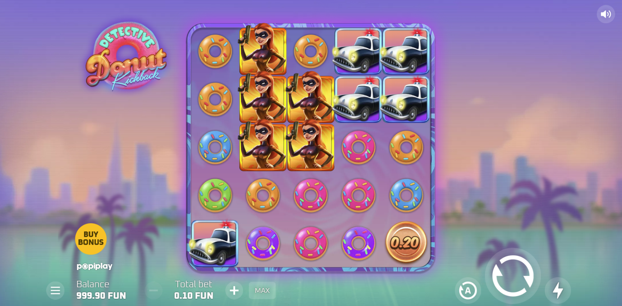 《Detective Donut Kickback》采用5×4的滚轮结构,共有40条固定支付线,符合现代视频老虎机的主流设计。界面布局直观,玩家能轻松掌握投注设定、自动旋转以及奖金信息等功能。滑稽的动画和人物插图让游戏充满趣味性,特别适合喜欢剧情元素的玩家。